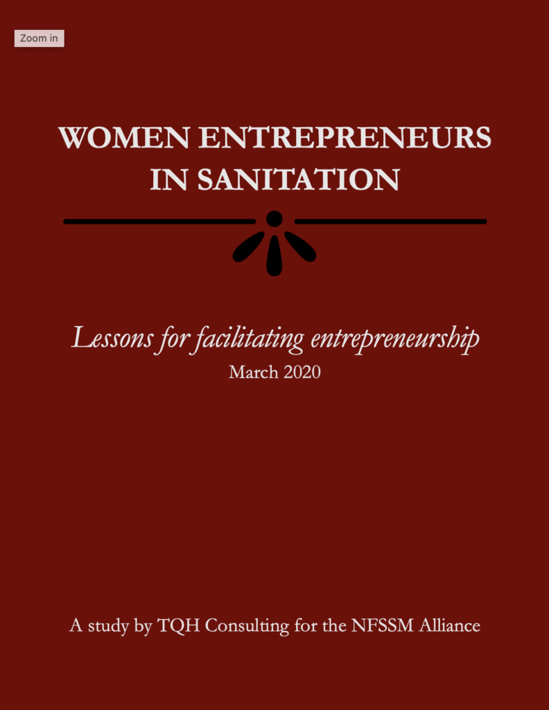 This study aims to leverage insights gleaned from ground level case studies of entrepreneurship so as to advocate for more systematic government support for women entrepreneurs, in general and more specifically, in the context of sanitation – an area of key concern for the National Faecal Sludge and Septage Management (NFSSM) Alliance.
